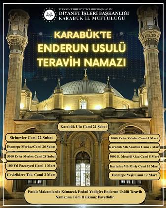 Bir Osmanlı geleneğinin yeniden yaşatılmasına yönelik Diyanet İşleri Başkanlığının bir faaliyeti olan “Enderun Usulü Teravih Namazı”, 5 ilçede ve 11 il merkezinde olmak üzere 16 camide yaşatılacak olup, 14 farklı din görevlisi tarafından İsfahan, Saba, Hüseyni, Uşşak, Rast, Segah ve Hüzzam makamlarıyla icra edilecektir.